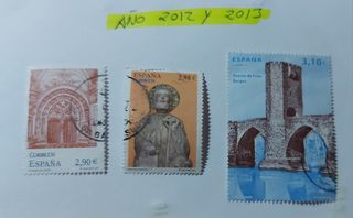 Conjunto de sellos de España de los años 2012 y 2013. - Catedrales "Santiago de Compostela. La Coruña" y "Oviedo" - Puentes "Frías, Burgos". Todos los sellos son usados.
