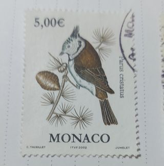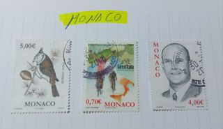 Lote de sellos de Mónaco. - Sello de 2002 "Herrerillo Capuchino" - Sello de 2009 Ciclismo. "Centenario del Giro de Italia". - Sello del 2009 Exposición Filatelica Internacional "Monacophil 2009" con retrato Alberto II. Todos los sellos son usados.