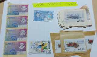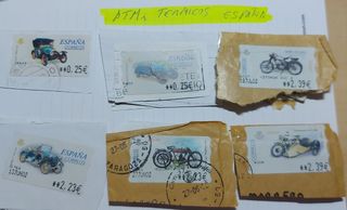 Lote de sellos de España ATMS térmicos. -4 sin usar 1995 "Emblema de Correos". -1996 "Globo terrestre y espacio". -1999 "Exposición Mundial de Filatelia España 2000" -2000 "XX Convención Ciudades Carnaval. Sta Cruz Tenerife" -2 del 2000 "Año Jubilar Lebaniego" 2001 -12 "Locomotora 030,2103" -2 " Hispano Suiza T" -1 "Peugeot Bébé" -4 "Rolls Royce S.G." -2 "Humber T" 2002 -6 "Norton" -7 "New Hudson" -2 "Motobecane B-44" -2 "Nimbus 750" -4 "Crucero Infanta Isabel" -2 "Pailebote Santa Eulalia" -"Vapor mixto Miguel Pinillos" -3 "Jabeque" -3 "Zaragoza" -"Cádiz" - "Logroño" -4 "Palencia" -"Ferrol" -5 "Madrid" 2006 -"Año de la M. Hist."