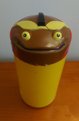 Lata metálica antigua con diseño de las Tortugas Ninja. - Personajes icónicos de Nickelodeon. - Tapa en relieve. - La base tiene un golpe en un lateral. - Laterales decorados con los nombres de las tortugas.