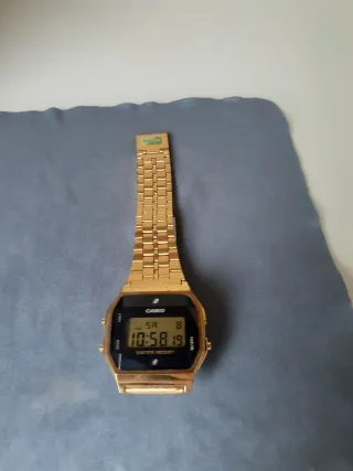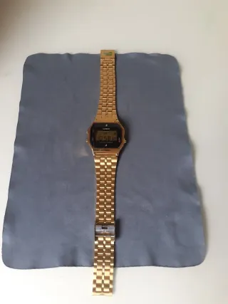 Reloj Casio vintage con acabado dorado. - Diseño clásico y atemporal. - Correa de acero inoxidable. - Pantalla digital. - Particularmente especial en la esfera con dos pequeños diamantes. - Buscado por coleccionistas y entusiastas de Casio. Precio no negociable