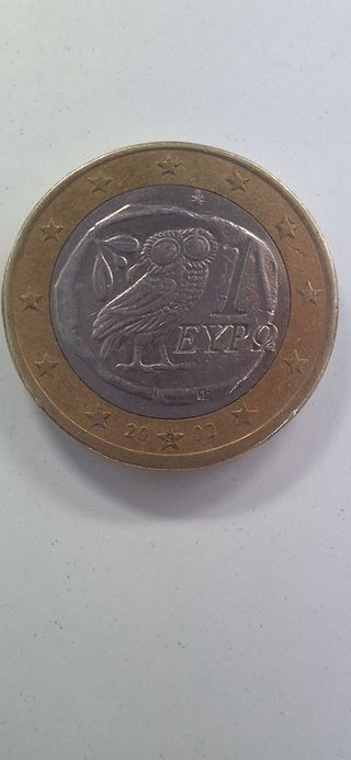 Moneda de 1 euro de Grecia con el diseño del búho. - Año de acuñación: 2002. - Diseño: Búho de Atenea con rama de olivo y la inscripción ΕΥΡΩ.