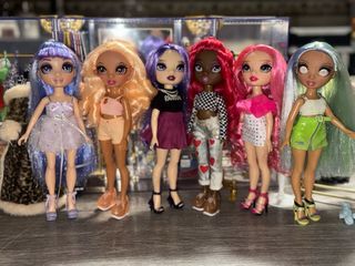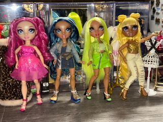 Cuatro muñecas Rainbow High. 15€ cada una - Muñeca con pelo rosa y vestido brillante. - Muñeca con pelo azul y chaqueta vaquera. - Muñeca con pelo verde lima y falda a juego. - Muñeca con pelo amarillo y top dorado.