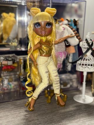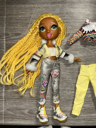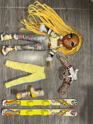 Muñeca Rainbow High con su ropa y accesorios. - Incluye pantalones amarillos con detalles de arcoíris. - Chaqueta amarilla con detalles de pelo blanco. - Jersey de punto multicolor. - Botas amarillas. - Esquís decorados con caritas y arcoíris.