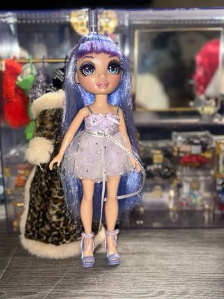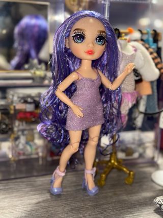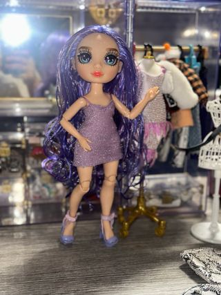 Muñeca de la marca Rainbow High con cabello largo y morado. - Vestido brillante morado. - Zapatos de tacón morados. - Accesorios de moda.