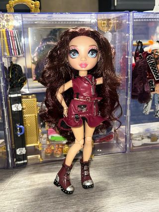 Conjunto de ropa para muñeca Rainbow High. - Chaqueta estilo motero en color burdeos. - Falda a juego con detalles metálicos. - Botas altas con cordones y adornos plateados.