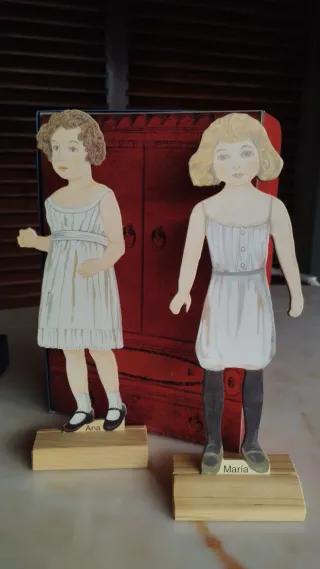 Conjunto de muñecas recortables de cartón, con sus ropitas y un armario. - Incluye dos muñecas, Ana y María. - Vienen con un armario de cartón rojo. - Las muñecas llevan vestidos y zapatos. - Incluye ropa adicional para vestir a las muñecas.