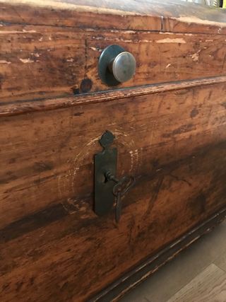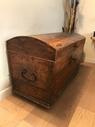 Este baúl de madera antigua es una pieza de ebanistería alemana. - Material: Madera. - Origen: Alemania. - Diseño: Baúl con tapa curva y herrajes metálicos. - cerradura funcionando con llave - libre de carcoma - ancho 122 cm , alto 75 cm y profundo 60 cm