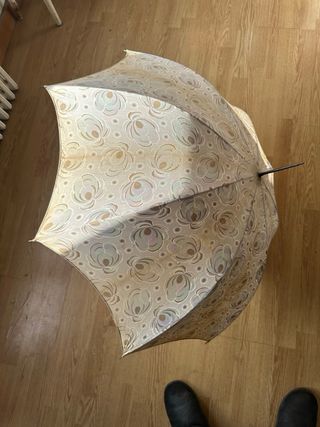 Conjunto de dos paraguas de tela de los años 40. Un accesorio vintage con un diseño elegante. - Tejido con estampado. - Mango de color negro.