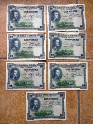Conjunto de 7 billetes de 100 pesetas del Banco de España, con fecha de Madrid del 1 de Julio de 1925. Cada billete presenta el retrato de Felipe II y una vista del Palacio Real. - Billetes de 100 pesetas. - Año de emisión: 1925. - Banco de España. - Período Alfonso XIII
