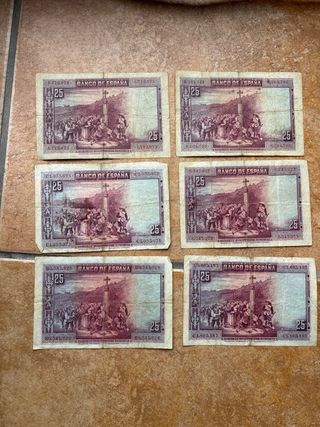 Conjunto de seis billetes de 25 pesetas del Banco de España, con fecha de Madrid 15 de Agosto de 1928. - Cada billete tiene un número de serie diferente. - Diseño con retrato y monumento. - Denominación: Veinticinco Pesetas.