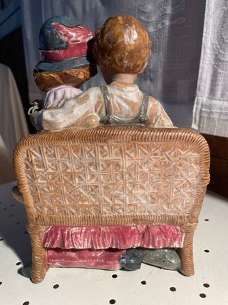 Encantadora figura de porcelana que representa a una pareja sentada en un sillón de mimbre. La figura está detallada con ropa de época y un corazón en forma de regalo. - Material: Porcelana. - Diseño: Pareja sentada. - Detalle: Corazón en forma de regalo.
