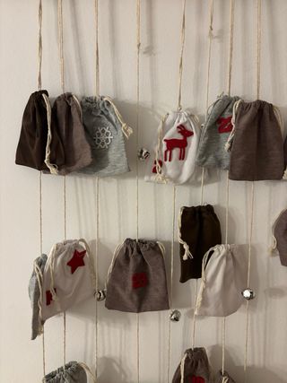 Calendario de adviento artesanal, perfecto para la cuenta atrás hasta Navidad. - Bolsitas de tela con cordón. - Diseños variados con motivos navideños. - Colgante de madera.