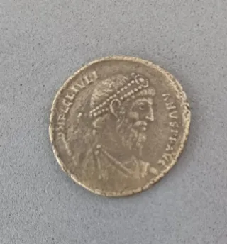 Moneda antigua de origen romano, con un diseño detallado en relieve. - Representación de un busto imperial. - Inscripciones latinas en el borde.