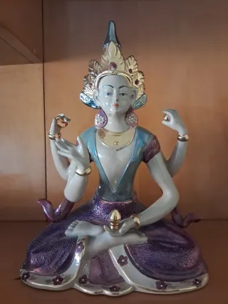 Figura decorativa con múltiples brazos y vestimenta detallada. - Diseño multicolor con detalles dorados. - Base ornamentada con flores. - Corona elaborada en la cabeza.