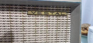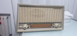 Radio antigua de la marca Vestal. Un diseño clásico que evoca épocas pasadas. - Frontal con dial y mandos. - Altavoz cubierto con tela. - Carcasa de color beige y detalles en burdeos. No funciona y por eso este precio