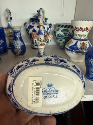 Conjunto de piezas de cerámica decorativa con un diseño clásico en azul y blanco. - Incluye varias miniaturas de jarrones y un cuenco. - Motivos florales y detalles calados.