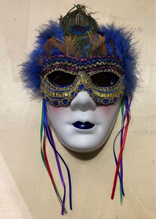Máscara de cerámica decorada, ideal para carnavales o eventos temáticos. Presenta un diseño llamativo con plumas y cintas. - Material: Cerámica. - Decoración: Plumas de pavo real y azules, detalles dorados y morados. - Adornos: Cintas de colores (rojo, verde, azul, morado) colgando a los lados.