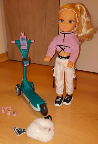 Muñeca Nancy con su patinete y accesorios. - Patinete de color turquesa , el patinete tiene luces en la rueda trasera y en el reposa móvil - Incluye teléfono móvil para el patinete. - Accesorios adicionales: bolso blanco peludo, zapatilla, spray y peine.