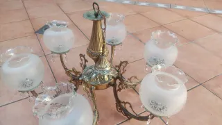 Elegante lámpara de bronce con un diseño clásico y detalles ornamentales. Perfecta para añadir un toque de distinción a cualquier espacio. Unos de los cristales tiene un agujero,ver en fotografía. - Material: Bronce - Acabado: Dorado