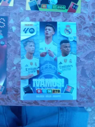 Carta de fútbol de la colección Adrenalyn XL 2026, con jugadores del Real Madrid. Carta en perfecto estado recién salida del sobre - Incluye a Rodrygo, Guler y Mbappé. - Destaca el escudo del Real Madrid. - Muestra estadísticas de juego. Precio negociable
