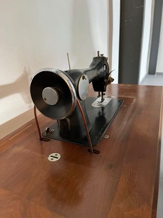 Máquina de coser Alfa de estilo vintage, con su mueble de madera y pedal. - Diseño clásico. - Mueble de madera con superficie amplia. - Pedal para accionamiento.