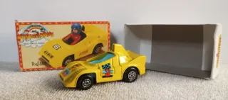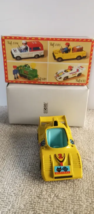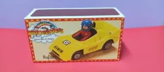 Coche de juguete amarillo de la marca Chiquicerillas, modelo Ref. 582. Presenta un diseño deportivo con detalles de carreras. - Color amarillo vibrante. - Incluye dorsal número 2 y bandera a cuadros. - Detalle de patrocinador 'CIBIE' en la caja. - Caja original incluida. El muñeco es de otra referencia.