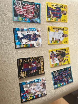 Lote de cartas de fútbol de la colección Panini. - Incluye cartas de jugadores como Raphinha, Lewandowski, Benzema, Bryan Gil, Nico Williams, Berenguer. - Cartas especiales: Imparables, Balón de Oro, Invencible, Super Crack, Special One Black.