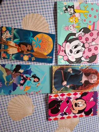 Conjunto de libretas con diseños de personajes de Disney. - Libreta con Moana y Pua. - Libreta con Mulan y Tiana. - Libreta con Minnie Mouse y amigos. - Libreta con Minnie Mouse y lazo rosa. - Libreta con Mérida.