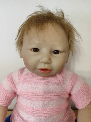 Muñeco bebé estilo reborn, tipo AliExpress. Tiene un aspecto muy realista. Tiene el peso de un bebé. Está bien conservado. Tiene las uñitas de manos y pies pintadas y también los labios. Marca OtardDolls. 45 cm - Ropa de punto rosa y azul. - Pelo rubio y ojos marrones.