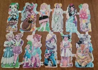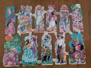 Conjunto de cromos vintage con escenas infantiles y personajes de cuento. - Ilustraciones a todo color. - Diseños variados con niños, animales y figuras fantásticas. - Ideales para coleccionismo o manualidades.