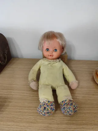 Muñeca vintage de la marca Famosa. Conserva su ropa original. No sé cuál es su nombre. Es de trapo con extremidades de plástico. 35cm. La muñeca está, bien necesita limpieza. - Pelo rubio recogido en dos coletas. - Ropa de dormir rosa. - Ojos marrones y boca entreabierta.