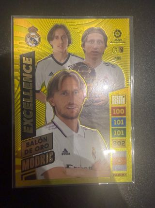 Carta coleccionable de Luka Modric, edición Excellence y Balón de Oro. - Incluye imagen de Modric con el Real Madrid. - Diseño dorado con detalles de hojas. - Muestra estadísticas del jugador.