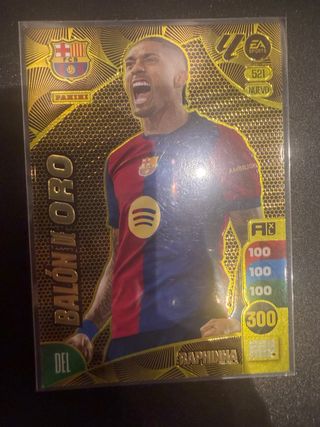 Tarjeta de colección Panini Adrenalyn XL del jugador Raphinha. - Edición Balón de Oro. - Número de carta: 521. - Incluye estadísticas de juego. - Diseño dorado con detalles de panal.