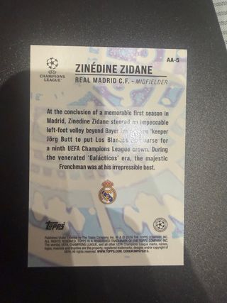 Tarjeta coleccionable de Zinedine Zidane de la marca Merlin. - Diseño con temática de astrología y Ageless Alchemy. - Incluye el escudo de la Champions League. - Nombre del jugador ZINÉDINE ZIDANE en la parte inferior.