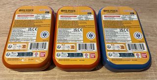 Conjunto de 3 latas metálicas del juego de cartas One Piece, volumen 2. - Diseño con personajes de One Piece. - Ideal para coleccionistas.