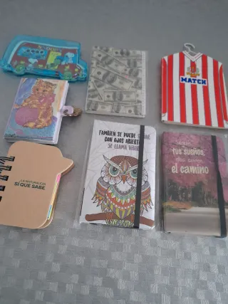 Conjunto de libretas y una agenda con diseños variados.6 sin estrenar la camiseta le faltan algunas hojas - Libreta con diseño de Snoopy. - Libreta con diseño de gatito. - Libreta con diseño de billetes de dólar. - Libreta con diseño de camiseta de fútbol. - Libreta con diseño de búho. - Libreta con frase La naturaleza sí que sabe. - Agenda con frase Sigue tus sueños, ellos saben el camino.