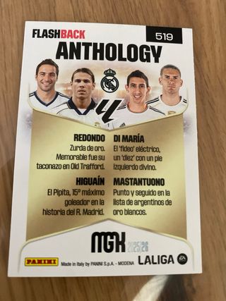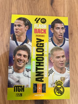 Carta de colección Panini Flashback Anthology de la temporada 2025/26. - Incluye a los jugadores Higuain, Redondo, Mastantuono y Di Maria. - Diseño especial Flashback de EA Sports. - Edición Medios de Panini.