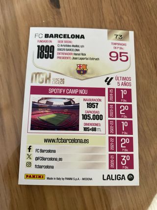 Carta de Panini de la temporada 2025/26. - Escudo del FC Barcelona. - Número de carta: 73.