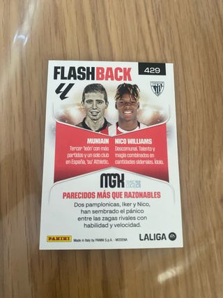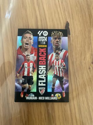 Carta coleccionable de fútbol de la colección MGK Flash Back de Panini para la temporada 2025/26. - Incluye a los jugadores Muniain y Nico Williams. - Diseño conmemorativo Flash Back. - Producto oficial de Panini y EA Sports.