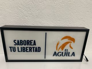 Cartel luminoso con el logo de Cerveza El Águila y la frase Saborea tu Libertad. - Diseño con iluminación. - Marco negro. Nuevo en perfecto estado. Largo: 55cm Alto: 25cm Fondo: 6,5cm
