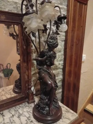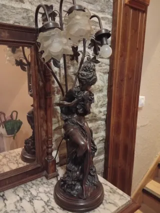 Elegante lámpara de mesa antigua con una figura decorativa. - Base y estructura de metal con acabado oscuro. - Figura femenina detallada. - Pantallas con diseño floral.