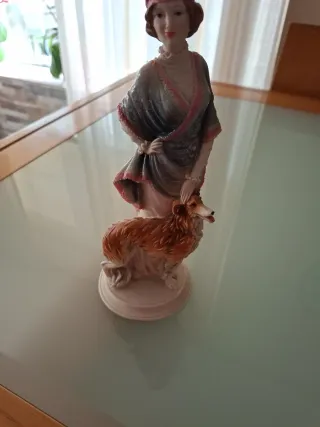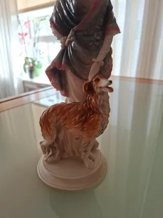 Figura decorativa de una mujer con un perro, de la marca A. Belcari. Representa una escena elegante. - Detalle de la vestimenta de la mujer con chal. - Figura del perro con pelaje detallado. - Base circular para exposición.