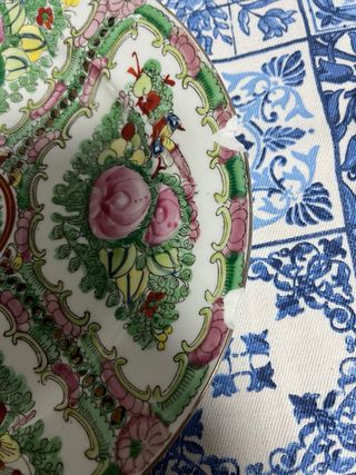 Precioso plato decorativo con un diseño floral y de aves. - Motivos florales en tonos rosas y verdes. - Figuras de pájaros coloridos. - Borde dorado. -Tiene como se puede ver en las imágenes desperfectos , por eso su bajo precio
