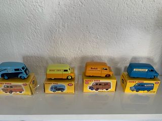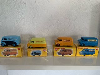 Conjunto de cuatro furgonetas de juguete Dinky Toys. - Furgoneta azul y negra Capstan. - Furgoneta amarilla y naranja Dinky Toys. - Furgoneta naranja Kodak Cameras & Films. - Furgoneta azul Ovaltine & Ovaltine Biscuits.