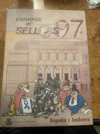 Catálogo de emisiones de sellos de España y Andorra del año 1997.solo embio por correos por no tener impost cerca - Portada con ilustración de edificio y personajes. - Sellos de Correos y Telégrafos. - Título: Emisiones de Sellos 97. - Texto: España y Andorra.