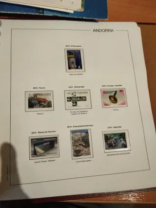 Colección de sellos de Andorra del año 2015, emitidos por Correo Español. - Sello El Románico - Virgen de Meritxell. - Sello Fauna - Rebeco. - Sello Efemérides - 25 años de enseñanza superior en Andorra. - Sello Europa, Juguetes - Peonza. - Sello Bienal de Venecia - Agustí Roqué. Between. - Sello Diversidad Andorrana - Comunidad inglesa. - Sello Deportes - Campeonato del mundo de trial. Montados en hojas EDEFIL sellos y hojas lote