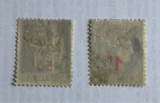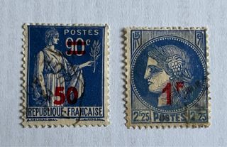 Dos sellos antiguos de la República Francesa con sobrecarga, uno de finales de 1800 y otro de los años 30. - Sello de 90 céntimos con figura femenina. - Sello de 2.25 con perfil femenino. - Diseño clásico y detallado.
