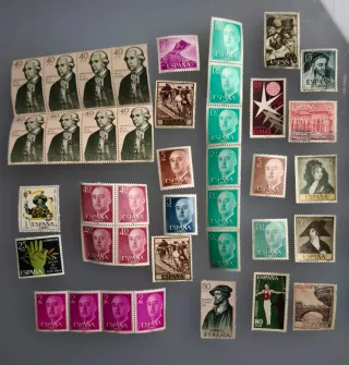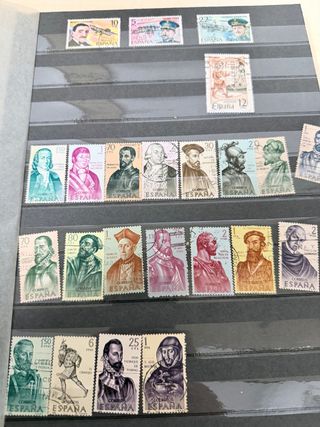 Colección de sellos de España. - Diversos diseños y valores. - Incluye sellos conmemorativos y de correo aéreo. - Algunos sellos muestran retratos históricos y monumentos.