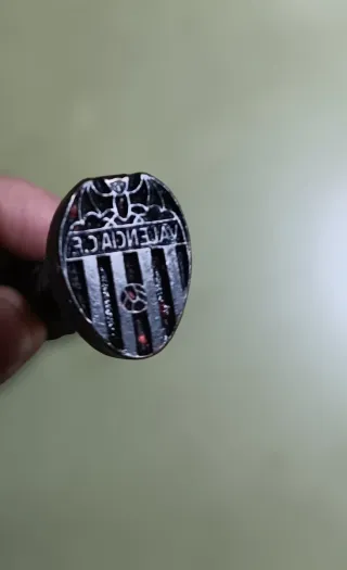 Sello antiguo con el escudo del Valencia C.F. - Diseño ovalado. - Incluye el murciélago y las franjas características del club. - Texto 'VALENCIA C.F.' en la parte superior. - Mango de madera. - Sello de metal.